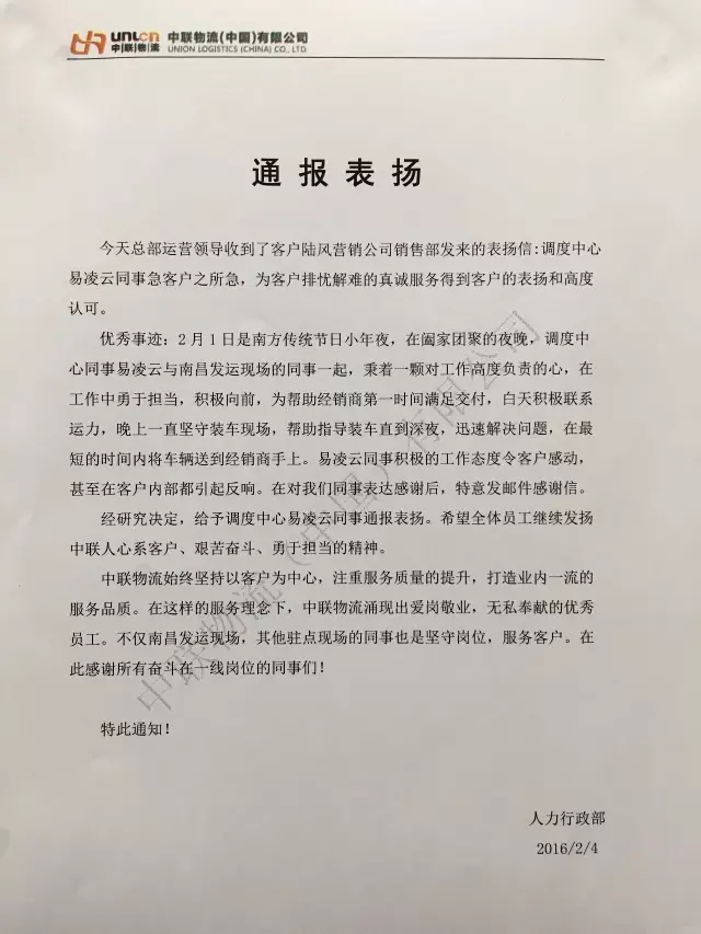 关于对调度中心易凌云的通报表扬