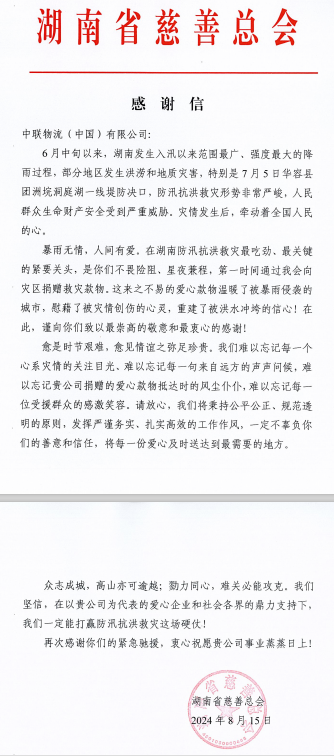 暴雨无情,人间有爱。面对突如其来的洪水灾害,中联物流快速响应政府号召,全力支援防汛抗洪工作,第一时间通过湖南省慈善总会向灾区捐赠救灾款物,这也是中联物流继捐助积石山地震灾区之后的又一次爱心援助。