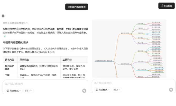 如今,这一切将被颠覆!中联物流正式上线了「体系文件AI知识库」,知识库沉淀了涵盖管理制度、操作规范、合规要求、技术指南等在内的海量文件资料,借助AI力量将海量体系文档转化为精准答案,体系文件从“静态文档”变为“动态智库”,促进了“提问即所得”的智能进化,实现了体系文件的高效管理与智能应用。