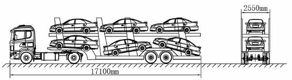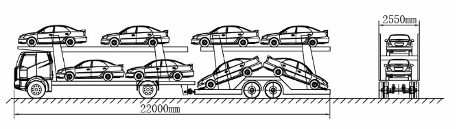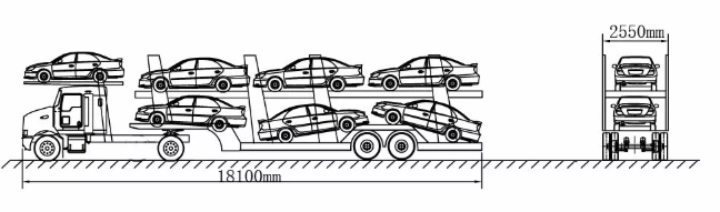 3.中置轴车辆运输车装载9辆以上的,严格执行装载长度不得超过22米、宽度不得超过2.55米、高度不得超过4米的要求。不符合要求的,公安交通管理部门依据《道路交通安全法》第九十条、《道路交通安全法实施条例》第五十四条规定,处二十元以上二百元以下罚款、记分,并根据《行政处罚法》第二十三条责令当事人改正违法行为。若装载乘用车车型较小,上层单排平放5辆车(不得上下左右倾斜)前后均不超过车辆运输车外廓尺寸的,可允许装载9辆车,暂不对超高进行处罚。